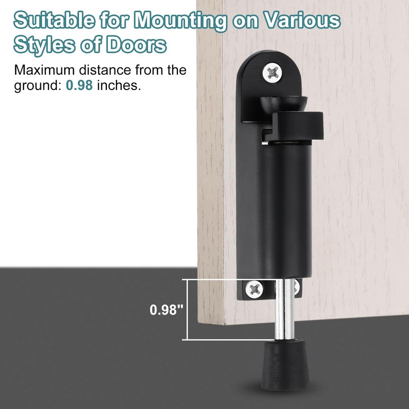 - [Size]: Body Size: 99mm/3.9"; Distance Between Screw Holes and Ground: 0-25mm/ 0-0.98"; Base Diameter: 20mm/0.79"; Closed Length:114mm/4.49"; Expanded Length: 132mm/5.2"; Package Contents: 2 Pack Kickdown Door Stop, 6 Mounting Screws