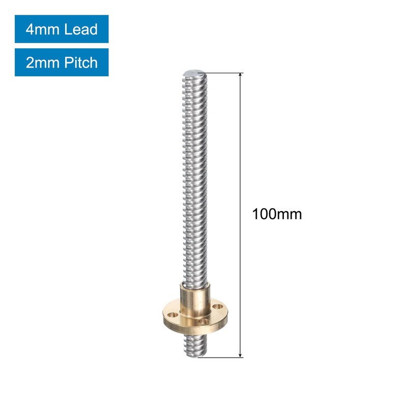 sourcing map 2 Pcs 100mm / 4 Inch Tr8x4 Stainless Steel Lead Screw with T8 Brass Nut - [ Acme Thread, 2mm Pitch, 8mm Lead ] for 3D Printer Z Axis, CNC Machine