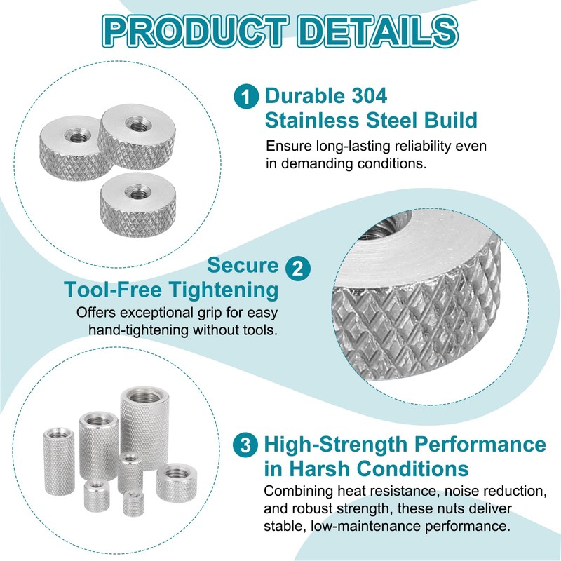 - Made of 304 stainless steel, it boasts a beautiful appearance, excellent anti-rust and anti-oxidation properties, high hardness, and a long service life. The knurled wing nut has deep and clear threads, uniform force during use, and good tightening force. The surface of the adjustment nut is knurled to provide a better grip, and it can be easily tightened, installed, and removed without tools.