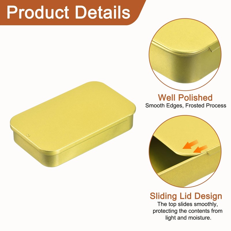 sourcing map 2 Pcs Metal Tin Box Container, 3.1x2x0.6 Inch Slide Top Tin Containers Empty Rectangular Storage Box Portable Mini Tin Case for Candy Cosmetic Crafts, Gold