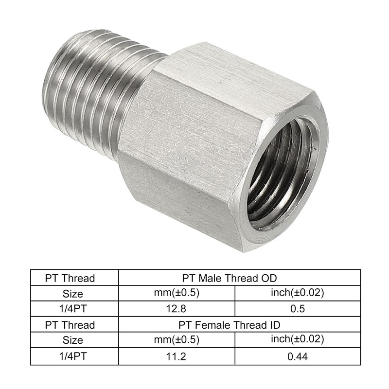 - Colour: Silver; Material: Stainless Steel; Male Thread Size: 1/4" PT; Female Thread Size: 1/4" PT; Male Thread Length: 13mm / 0.51"; Female Thread Length: 12mm / 0.47"; Total Size: 30x17mm / 1.18x0.67" (L*Hex B)