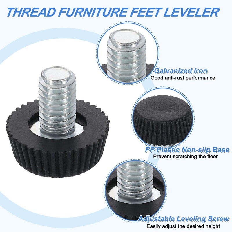 - [Widely Applicable]: The threaded furniture feet screws are widely used in leveling indoor and outdoor tables, chairs, stools, dining tables, cabinets, wardrobes, TV cabinets and other furniture, suitable for a variety of ground types such as wooden floors, tiles, carpets, etc.