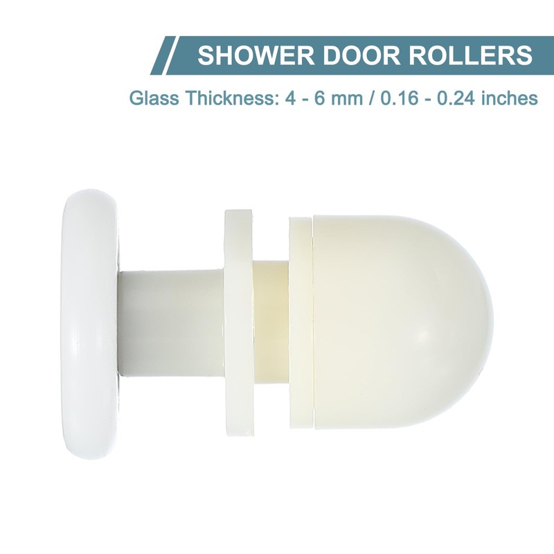- Color: White; Material: Plastic, Nylon; Length: 40 mm / 1.57 inch; Wheel Diameter: 25 mm / 0.98 inch; Groove Diameter: 9 mm / 0.35 inch; Glass Thickness: 4 - 6 mm / 0.16 - 0.24 inches; Glass Hole Spacing: 12 - 14 mm / 0.47 - 0.55 inches; Package Content; 8 x Shower Door Rollers