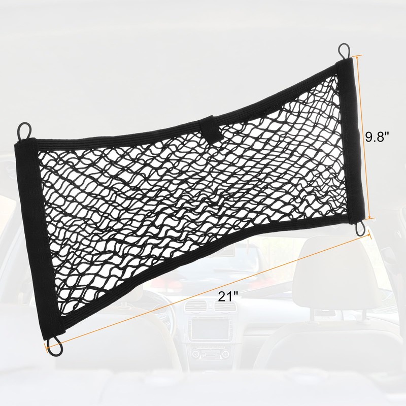 - Size - Total Size: 21" x 9.8"(L*W); Package Content: 2pcs x 2-Layer Cargo Net, 8pcs x Mounting Screws, 8pcs x Built-in Hooks.