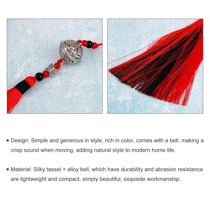 - Material: Polyester Tassel + Alloy bell; Total Length: 31cm/12.2"; Bells Dia: 27mm/1.06"; Color: Red Black