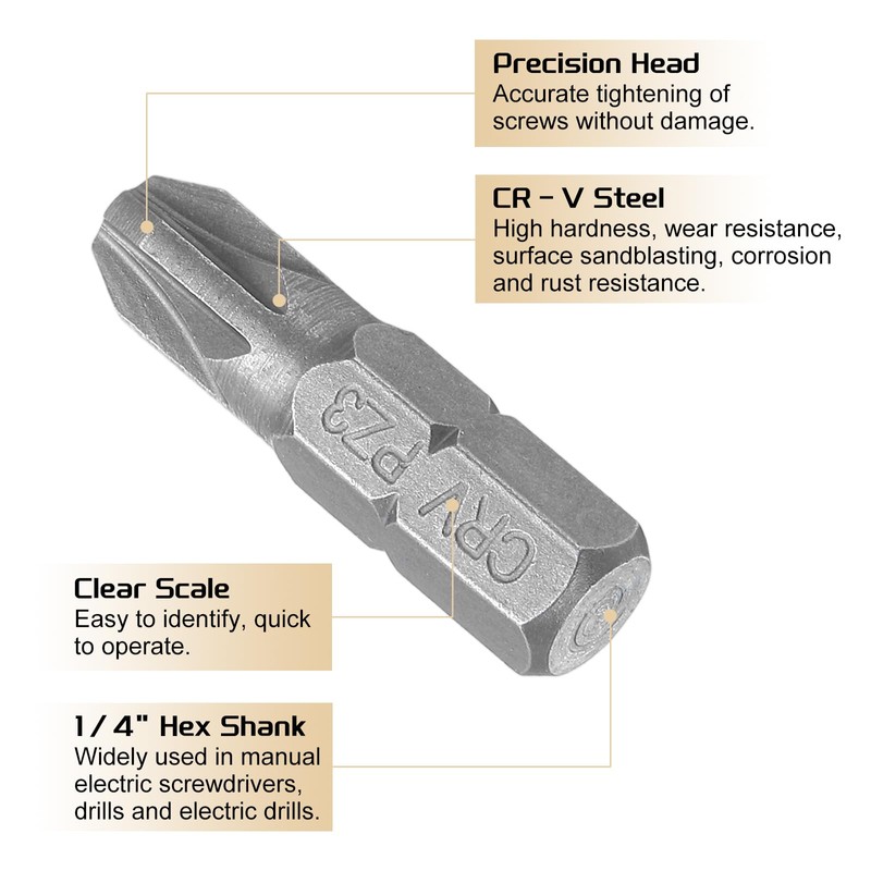 - Size - Bit Type: PZ3; Hexagonal Shank: 1/4"; Total Length: 25mm / 1"; The screwdriver bit is exquisitely made, each edge can lock the screws accurately, and will not easily damage the screws and screwdriver heads.