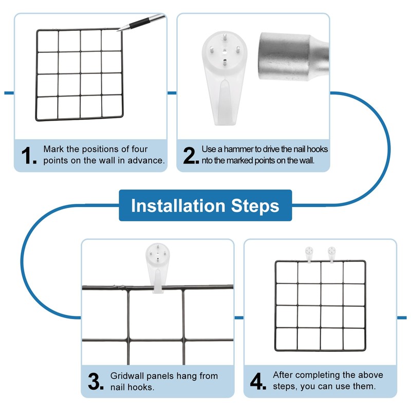 Easy to Install: Attach panels using screws or nails through the pre-drilled holes. Then hang the grid on the hook to complete the installation. Clip hooks or baskets onto the grid, adjusting their positions as needed.