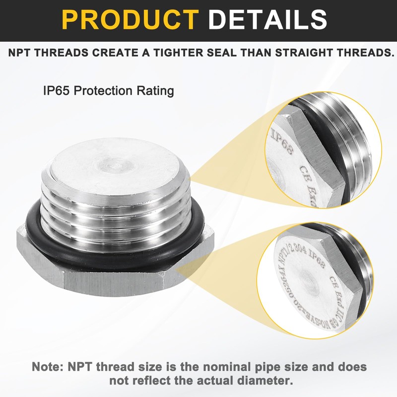 - Features - Hex head plugs featuring sealing rubber rings, provide effective protection against dust ingress and water exposure and withstand extreme environments with a temperature range from -80°F to 1472°F. With an IP65 protection rating, they ensure reliability in demanding conditions