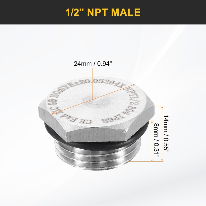 - Size - Thread Size: 1/2" NPT Male (NPT threads create a tighter seal than straight threads.); Thread Length: 8mm / 0.31"; Hex Width: 24mm / 0.94"; Total Length: 14mm / 0.55". National Pipe Taper (NPT) threads are designed to securely connect with threaded pipes. The thread is deep, the force is even, and it is not easy to slip.