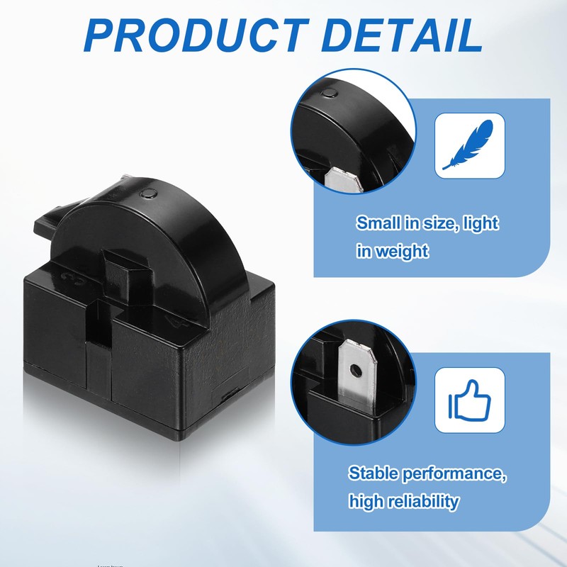 PTC refrigerator compressor relay is made of durable materials, with stable performance, high reliability, compact design, small space occupation, easy installation, can be directly replaced, can work normally and restore the refrigerator's cold air. It is an good spare part for replacing old refrigerator parts and is suitable for use in various types of refrigerator equipment.