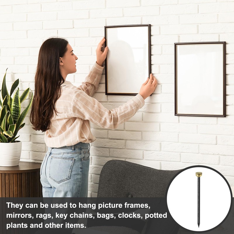 Material - The picture nails are made of iron, which is strong, durable, strong in load-bearing capacity, not easy to deform, and has a long service life. The nail caps are made of brass, which has a beautiful metallic luster.