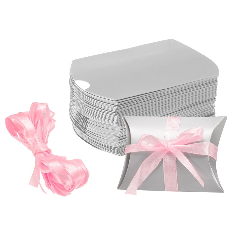 sourcing map 50Pcs Pillow Boxes 3.5 x 2.8 x 1 Inch Gift Boxes with Ribbons, Presents Paper Candy Favor Boxes for Gift Wrap Wedding Birthday Party, Silver Tone