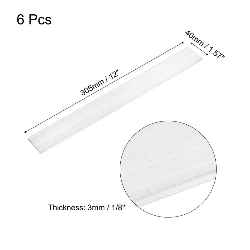 - The Long Square Aluminum Flat Bar, we provide here is in the size of:Length: 305 mm/12 inch Width: 40mm / 1.57 inch; Thick: 3mm / 1/8 inch; Material: 6061 Aluminum Alloy In the package of: 6pcs x Aluminum Flat Plates