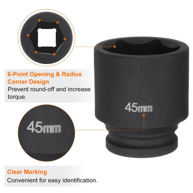 • Size - Drive: 3/4-inch, 6-Point Socket Size: 45mm, Total Length: 70mm / 2.8-inch. The specifications are clearly marked on the surface of the socket, which is easy to identify and improves work efficiency.
