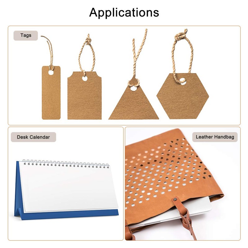 • Applications: Specially used for punching tags, wall calendars, desk calendars, account books, and handbags. Suitable for ordinary paper, offset paper, coated paper, grease film paper, leather, fabric etc.