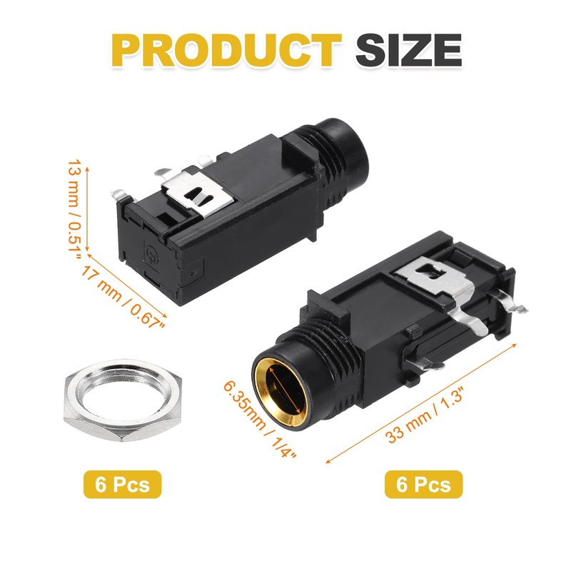 - TS6.35 Dual Channel Jack: Size: 33 x 17 x 13 mm / 1.3 x 0.67 x 0.51 inch (L x W x H); Rated Voltage: 50V; Pin Number: 3 Pin; Style: 1/4" 6.35mm Female;