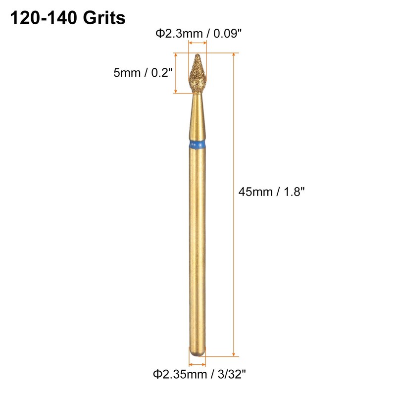 - Size - Grits: 120-140 Grits; Diameter: 2.3mm / 0.09"; Head Length: 5mm / 0.2"; Shank Diameter: 2.35mm / 3/32"; Shank Length: 40mm / 1.57"; Total Length: 45mm / 1.8"; The multi-purpose tool diamond drill bit set is packaged in a sturdy plastic box for your convenience to carry and store