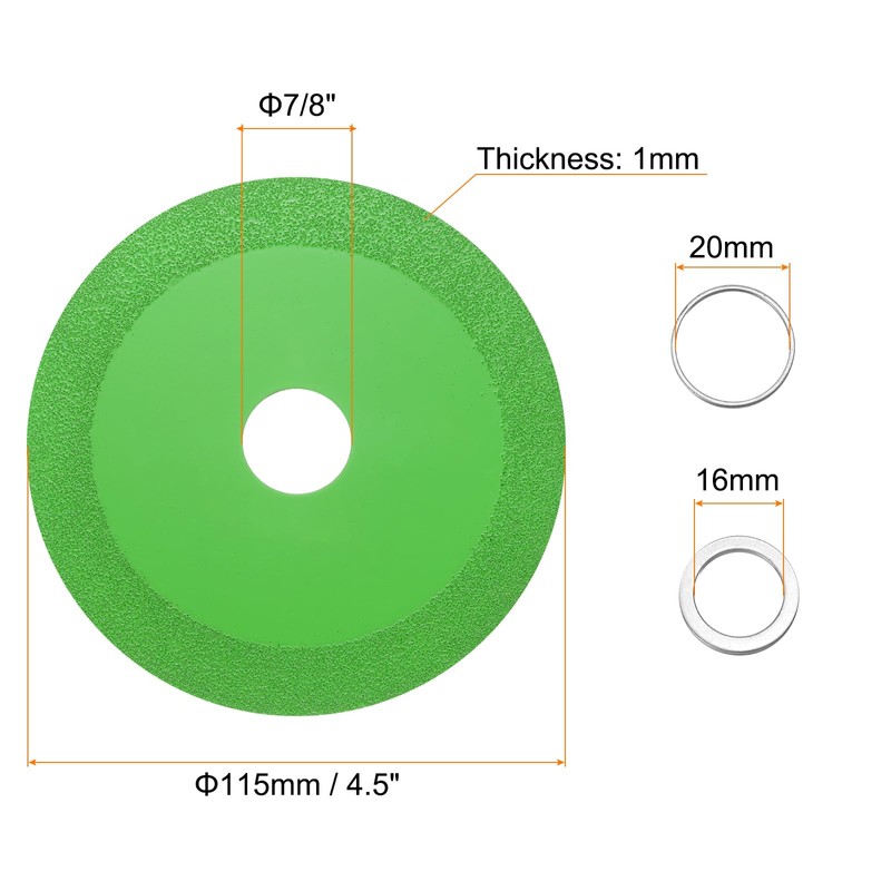 - Size - Diameter: 4.5" / 115mm; Bore Diameter: 7/8"; Thickness: 1mm; Color: Green; Material: Brazed; 8 Pack x Ultra-Thin Glass Cutting Disc (Includes 16 spacers)