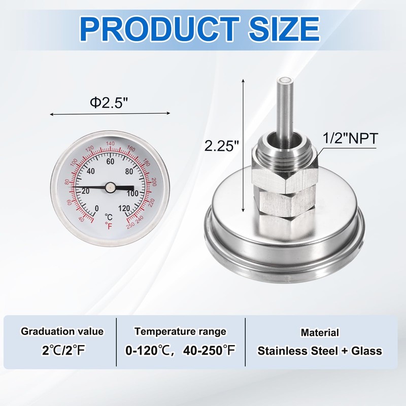 - Material:Stainless Steel + Glass;Graduation value: 2Degree C;Pointer Color: Black;Diameter: 2.5in;Temperature range: 0 to 120 degrees C;1Pcs x Bimetal Thermometer