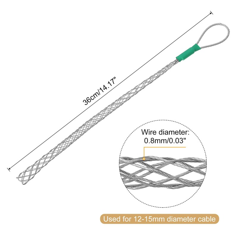 - The wire puller socks ,is in size of:Length:36cm/14.17 inch;Wire diameter:0.8mm/0.03 inch;Diameter:for 12-15mm cable;Color:Green;Material: galvanized steel;In the package of: 1 x Single Wire Mesh Puller Socks Grip;