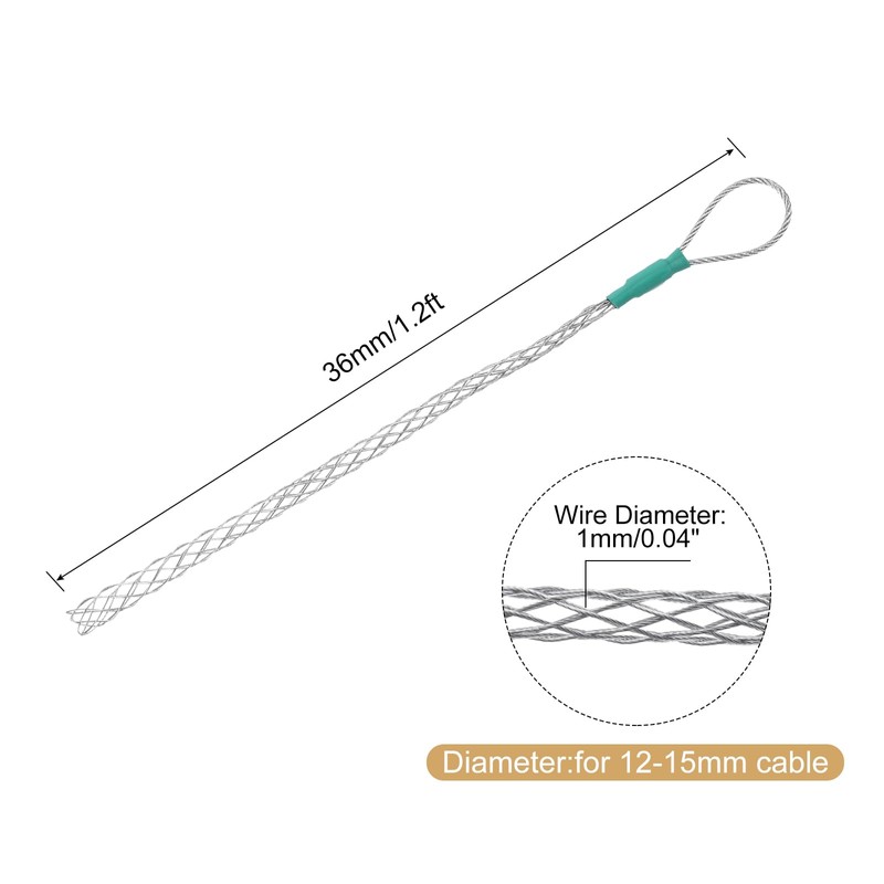 - Length: 36 cm/1.2 Ft; Suitable for Pipe Dia.: 12-15mm/0.47-0.59-inch; Wire Dia.: 1mm/0.04-inch; Color: Silver; Material: Galvanized Steel; In the package of: 1 x Cable Pulling Socks Grip