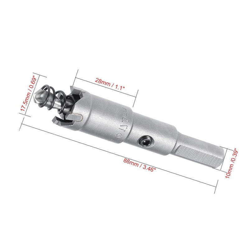- Specifications: Cutting diameter: 17.5 mm/0.69 inches; Shank size: 10 mm/0.39 inches; Cutting depth: 28 mm/1.1 inches; Total length: 88 mm/3.46 inches; non-slip triangular shank. The carbide hole cutter has a longer service life than normal metal hole cutters