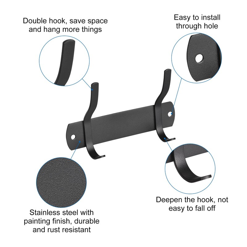 sourcing map Coat Hook Rack, Stainless Steel Wall Mounted Coat Rack with 2 Hooks Hook Rail Wall Hangers for Hanging Bedroom Bathroom Black