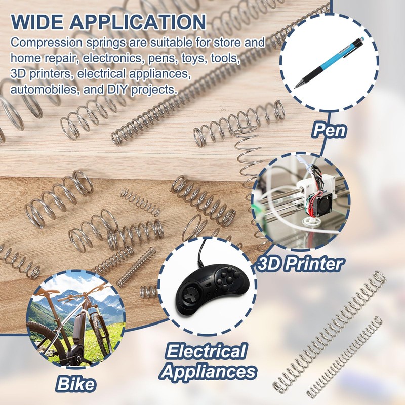 Compression springs are widely used for daily life maintenance and are suitable for store and home repairs, electronics, pens, toys, tools, 3D printers, appliances, automotive, and DIY projects.