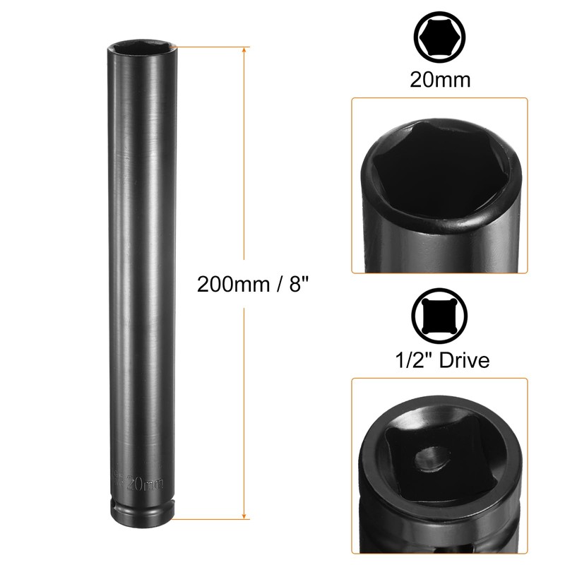 - Size - 6-Point Socket: metric socket size: 20mm, square drive: 1/2", total length: 200mm / 8"; Socket Adapter: hex shank: 1/4"; square drive: 1/2"; total length: 50mm / 1.97".