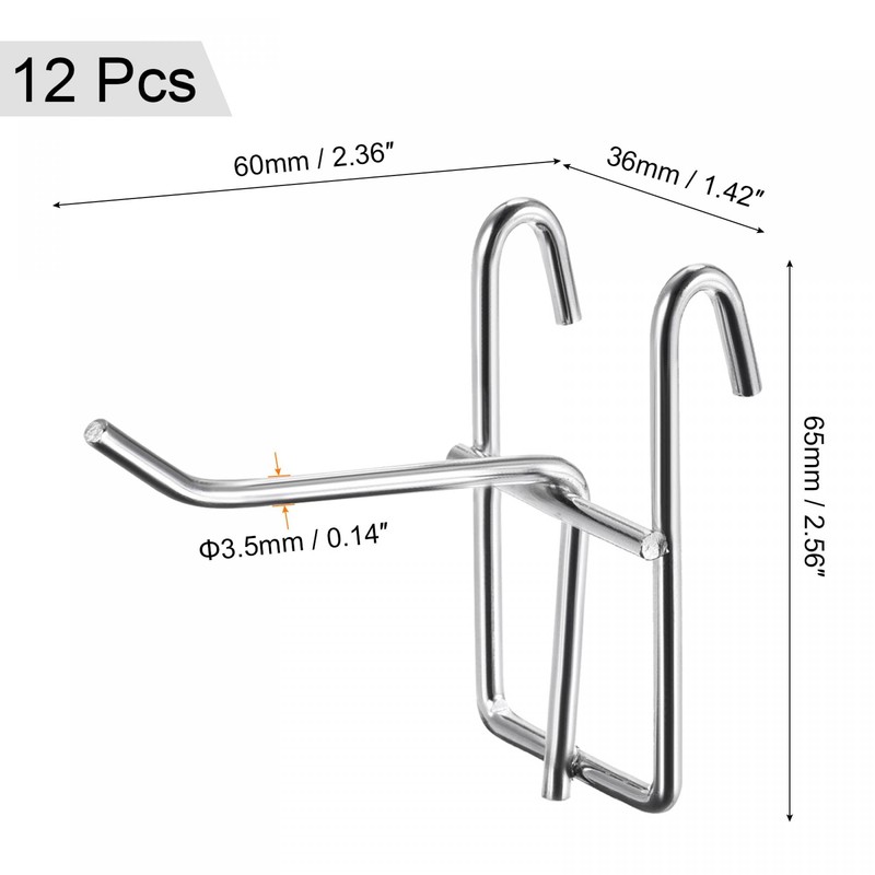 - The grid wall hooks are in the size of: Total Length: 60mm / 2.36 inch; Hook Thickness: 3.5mm / 0.14 inch; Base Panel Size: 65mm x 36mm / 2.56 x 1.42 inch (L*W)