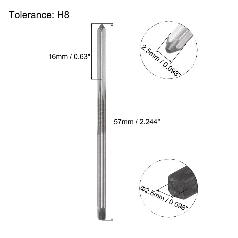 - Hand Reamer Size: Cutting diameter: 2.5mm / 0.098"; tolerance: H8; cutting flute length: 16mm / 0.63"; shank diameter: 2.5mm / 0.098"; shank length: 25mm / 0.984"; overall length: 57mm / 2.244"; style: straight flute, square shank