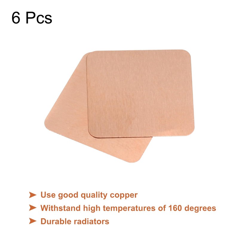 - Package content: 6Pcs x Copper Sheet; Dimension: 15mm x 15 mm/0.59 inch x 0.59 inch (L*W); Thickness: 0.1mm/0.004 inch; Material: Copper