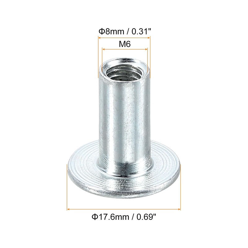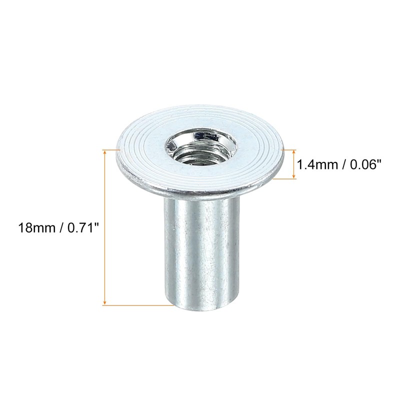 • Female Thread Diameter: M6; Pitch: 1mm; Round Base Diameter: 17.6mm / 0.69"; Round Base Thickness: 1.4mm / 0.06"; Total Height: 18mm / 0.71"; Drill Hole Diameter(Rod Diameter of Nut): 8mm / 0.31"; Package Content: 50pcs x Tee Nuts