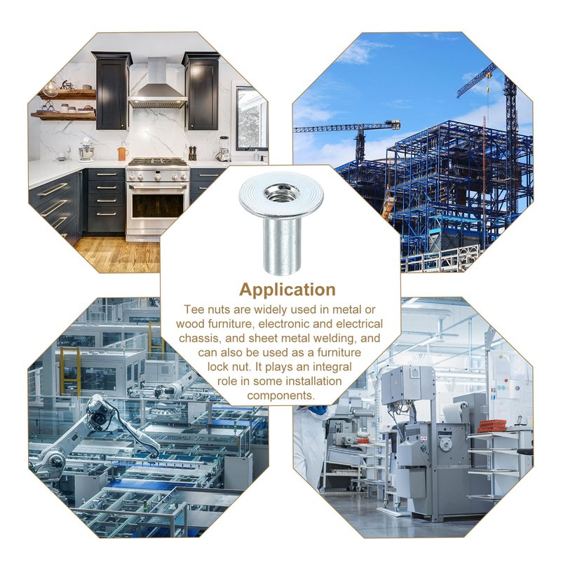 • Application: Tee nuts are widely used in metal or wood furniture, electronic and electrical chassis, and sheet metal welding, and can also be used as a furniture lock nut. It plays an integral role in some installation components.