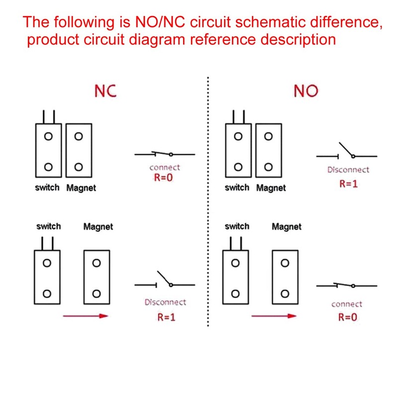 - [N.O./N.C.] - N.C. Normally means closed: when the magnet is together, the circuit is conductive (light on); when the magnet disconnects, the circuit is not conductive (light off). N.O. Normally means open: when the magnet disconnects, the circuit is conductive (light on); when the magnet is together, the circuit is not conductive (light off). When you place an order, please check carefully!