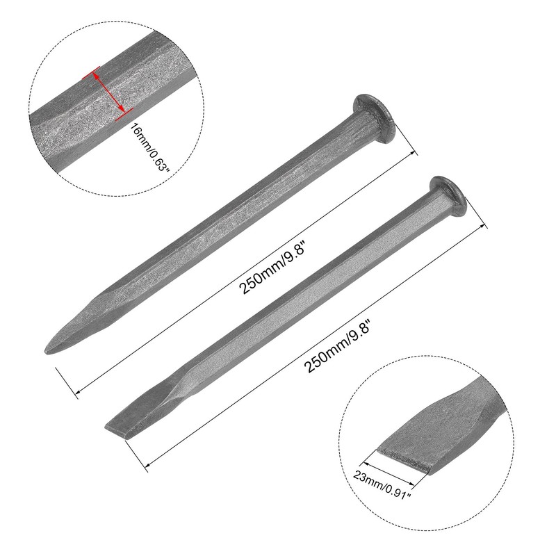 - Flat Head Width: 23mm/0.91 inch, Chisel Diameter: 16mm/0.63 inch, Total Length: 250mm/9.8 inch.