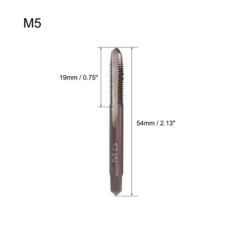 - Metric Taps: Thread Size: M5; Pitch: 0.8; Shank Side Width: 4mm / 0.16 inch; Thread Length: 19mm / 0.75 inch; Total Length: 54mm / 2.13 inch