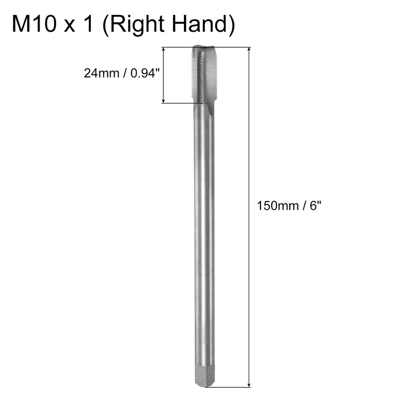 - Metric Thread Tap: Thread size: M10 x 1 (right hand); accuracy: H2; total length: 150mm / 6" (extra long); square shank width: 6.2mm / 0.24"; thread length: 24mm / 0.94"; number of chip flutes: 3 flutes. The tapping depth should not exceed 1.5 times the diameter of the tap. The 150 marked on the product refers to the total length.