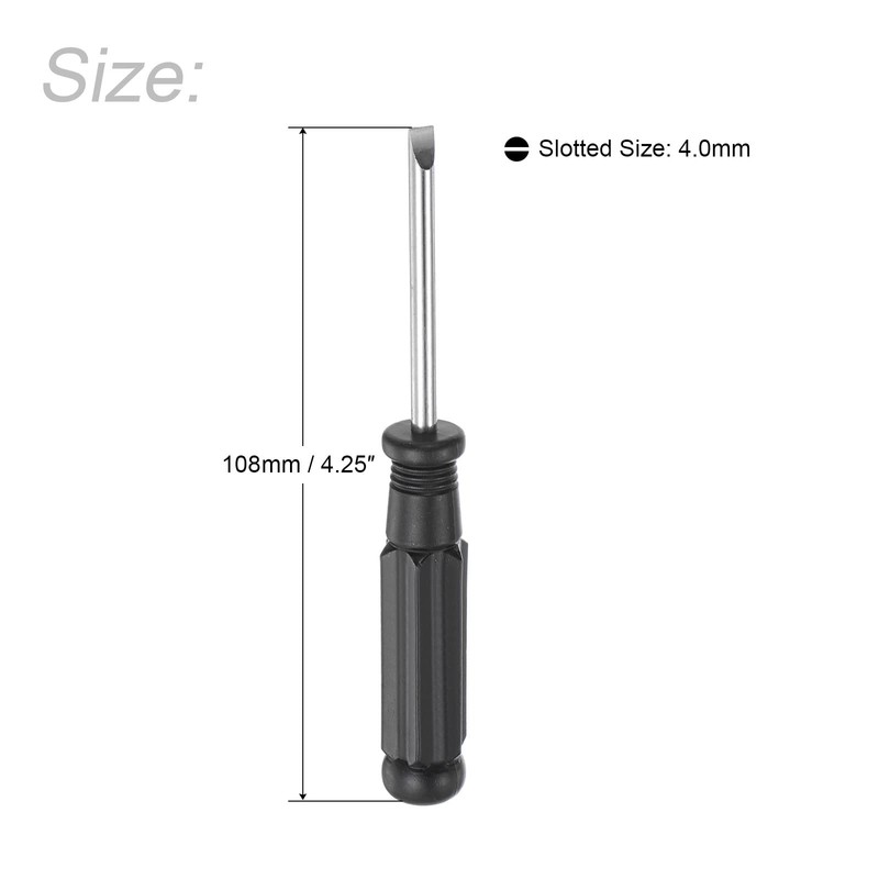 - Size - 4.0mm flat head, 4.25" (108mm) total length. This screwdriver is a small screwdriver, suitable for handling some small screws, such as those used in electronic products, glasses, watches, etc.