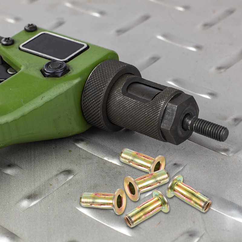 • Drill a hole according to the size of the rivet nut installation hole, insert the rivet nut, and tighten the locking nut with the rivet tool.