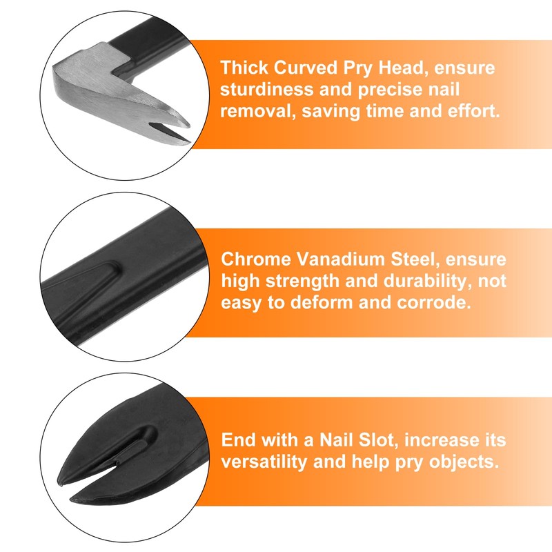 The pry head adopts a thickened design to ensure its sturdiness and durability, and also adopts a curved design to achieve precise nail removal and prying, saving time and effort. The nail remover also has a nail slot at the end for added versatility. The crowbar is finely polished to make it less likely to leave indentations and scratches on the contact surface during use.