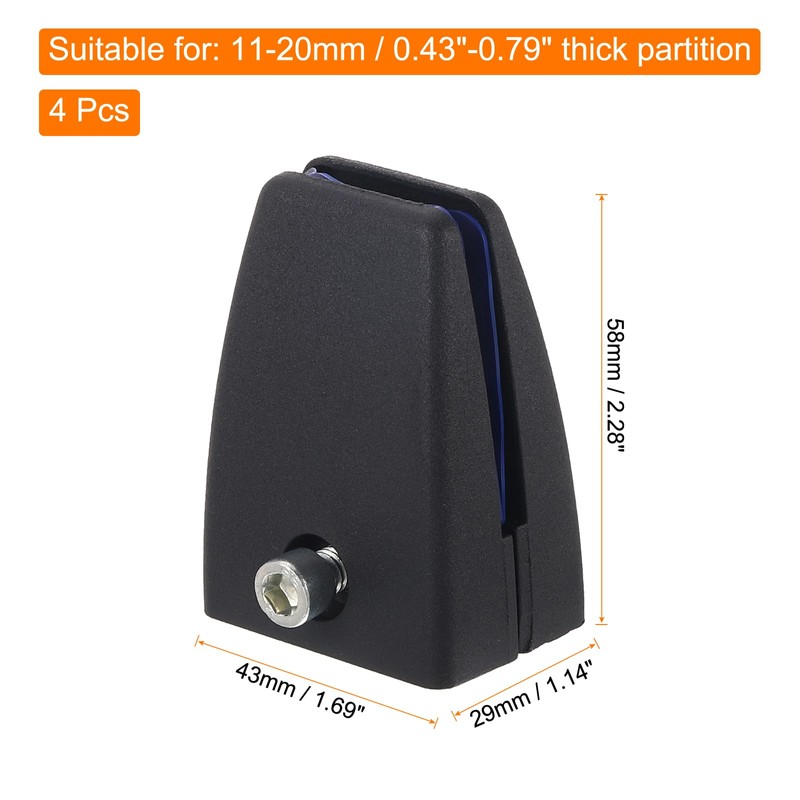 - Color: Black; Suitable for: 11-20mm / 0.43"-0.79" thick partition; Mounting Hole Dia: 5mm / 0.19"; Dimension: 43 x 29 x 58mm / 1.69" x 1.14" x 2.28"(L*W*H); Package Content: 4pcs x Partition Brackets, 4pcs x Adjustable Screws, 8pcs x Washers