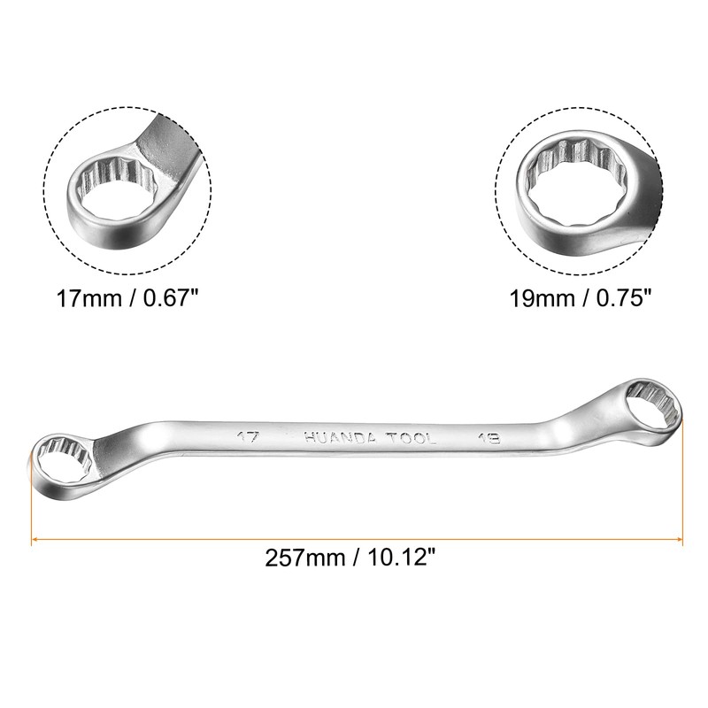 - Size - Product Name: Double-End Box Wrench; Offset Degree: 45-Degree; Finish: Matte; Box End Size: 17mm / 0.67", 19mm / 0.75"; Total Length: 257mm / 10.12"; Material: CR-V; Package Content: 1pcs x Box Wrench.