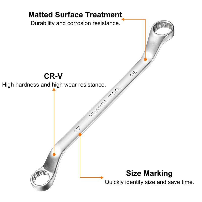 Offset double-end wrench tools can widely tighten or loosen nuts and bolts in many narrow spaces. Suitable for automotive repairs, home maintenance, mechanical repairs, plumbing repairs, and most general repairs.