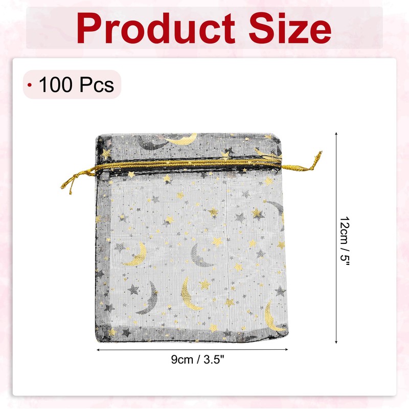 sourcing map Organza Bag 3.5" x 5", Sheer Moon Star Mesh Bags Drawstring Gift Bags Bulk Party Favor Bag Jewelry Pouches for Wedding Candy Valentines (Black-Gold, Pack of 100)