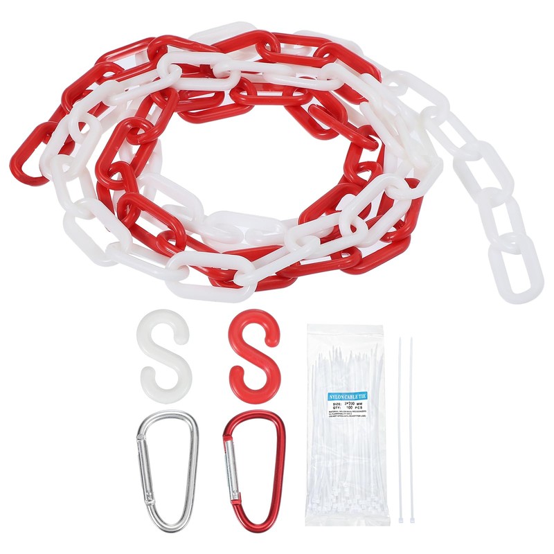 - The safety chain set we provide here is the plastic chain size: 1.53 Meters x 2.4 cm x 8 mm / 5 feet x 0.94 x 0.3 inch (L*W*T); In the package of: 1 x Red White Plastic Chain Barrier, 2 x S-Hooks (Each color has 1pcs), 2 x Buckle (Each color has 1pcs), 100 x Zip Ties