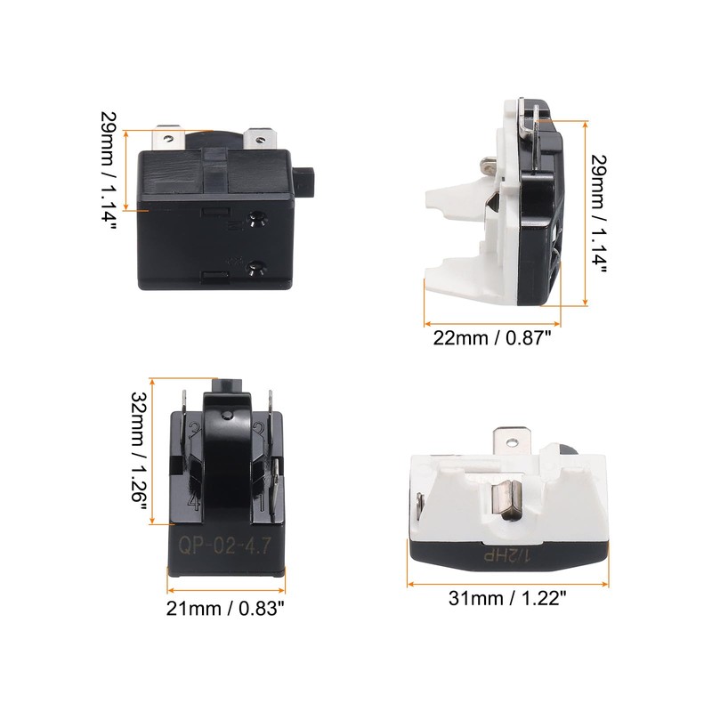 • PTC start relay, is in size of :3 pin, 31mm x 22mm x 29mm/1.22 inch x 0.87 inch x 1.14 inch(L*W*H); Refrigerator overload protector, is in size of : 32mm x 21mm x 29mm/1.26 inch x 0.83 inch x 1.14 inch(L*W*H)