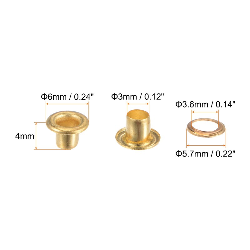 - Size - The eyelet size is 3 mm / 0.12 inch inner diameter x 6 mm / 0.24 inch outer diameter. The washer size is 3.6 mm / 0.14 inch inner diameter x 5.7 mm / 0.22 inch outer diameter.
