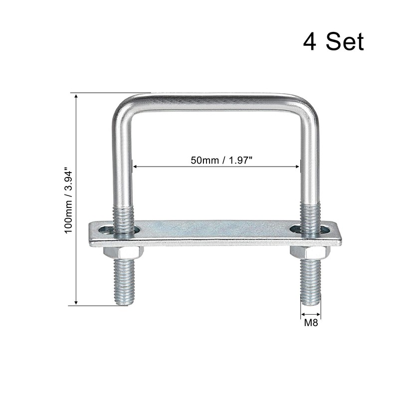 sourcing map Set of 4 square U-bolts U-bolts U-bolts U-bolts 2 inches (50 mm) inner width 100 mm length carbon steel M8 with nuts, frame plate, round washers