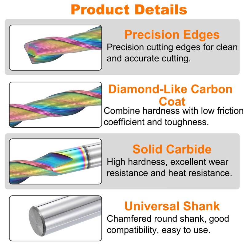 - Material - Made from solid tungsten carbide with an HRC of 49-51, ensuring great durability and longevity. The tungsten carbide construction provides superior wear resistance and maintains sharpness even under heavy use, making it good for demanding woodworking applications. Diamond-like carbon coatings combine the hardness and low coefficient of friction of diamond with the toughness of carbon. Offers excellent reduced friction, and improved performance in dry machining applications.